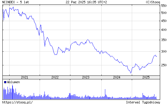 wykres w skali 5 lat wygląda jeszcze straszniej  kliknij, aby powiększyć(mimo wszystko ja wciąż inwestuje na NC i na nim szukam swoich rakietek, problem że teraz przypomina to stąpanie po gęstym polu minowym) * "Diversification is protection against ignorance, it makes little sense for those who know what they’re doing." W. Buffet. * "The market can remain irrational longer than you can remain solvent" * "scared money don’t make money" aktualny portfel szacunkowo: 75% CRJ, 20% PDG, 5% THD