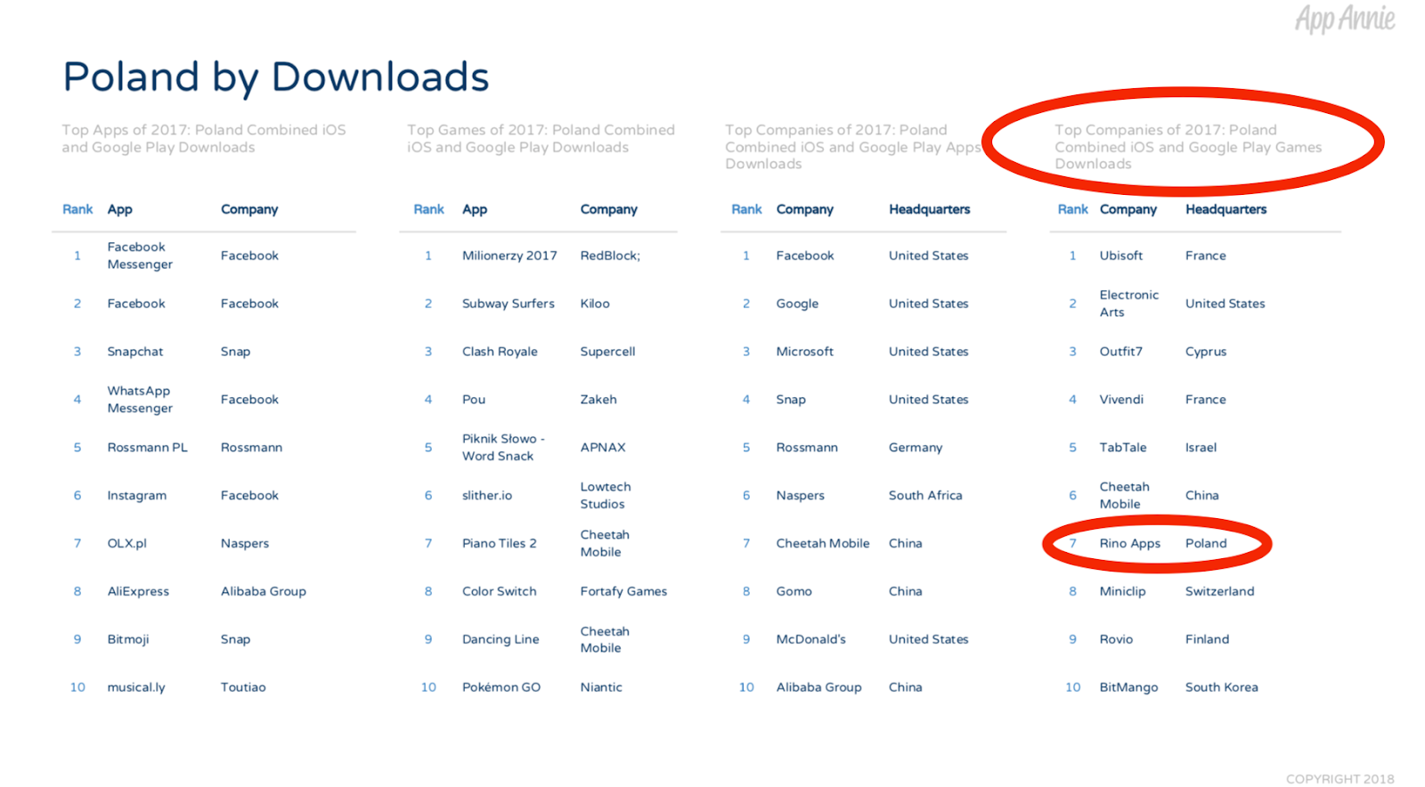 Zeto: Panie Darku, w 2017 r. 100 mln pobrań własnych gier miał Tbull, a w tej tabeli go nie ma. Poza tym wśród deweloperów wymienia się Cheetach, a on był tylko wydawcą takich tytułów jak Dancing Line i Dancing ball od Boombita. To zestawienie NIE pokazuje, że byliście 7 największym deweloperem gier, tylko że na Polskim rynku mieliście jako Rino Apps 7 największą liczbę pobrań, więc informacja wprwadza w błąd.