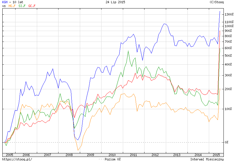 Techniczmie najbliższe wsparcie to mogą być okolice 80PLN wynikające z dołków pażdziernik 2011 i maj 2012. Potem jakieś odbicie w okolice dołków z marca 2014 czy stycznia 2015 i dalszy marsz na południe tak jak wcześniej pisałem. >> stooq.pl/q/a/?s=kgh&i=w&am...Poniżej wykresy KGHM i trzech produkowanych tam metali. Widać, że do bessy z 2008 r kurs KGHM korelował się z kursem miedzi. Później zaś ze srebrem. O ile kursy tych metali znacząco spadły do poziomów z lat 2009-2010 to KGHM aby osiągnąć tamten zakres cenowy musiałby jeszcze spaść do poziomów, które wskazałem we wcześniejszej analizie.  kliknij, aby powiększyć Warto zauważyć, że dzisiejszy poziom notowań okolice 85-84 to poziom zniesienia 50% fibo całego ruchu wzrostowego od początku notowań. Być może zaznaczy się to w jakiś znaczący sposób na notowaniach odmiennie od moich wcześniejszych spekulacji. Do takich założeń dokłada się RSI, który dotarł do poziomu zerowego sugerując odwrócenie trendu. Sądzę, że bedzie to jednak tylko korekta ostatnich spadków. Kopanie się z koniem jest najlepszą reklamą konia.