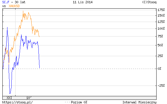 @Szutnikno tak, ale z ty, odreagowaniem na surowcach i zmianą kursu to może być jak ze złotem  kliknij, aby powiększyćrosło teraz sztucznie 15 lat... możliwe że jeszcze 10 będzie spadać. Tak samo w trendzie bocznym albo w trendzie spadkowym wiele lat mogą być inne surowce. Ja jestem ogromnym sceptykiem wobec firm opartych na surowcach, tak jak i wobec gospodarek opartych na nich (Rosja, Iran itd). Światowy klimat inwestycyjny jest zdecydowanie przeciwko, a banki inwestycyjne raczej siedzą na shortach niż longach surowcowych, z GS na czele.. a jak to mówią - nigdy nie graj przeciwko Goldman Sachs. Siedząc na longach JSW tak naprawde grało się przeciwko. * "Diversification is protection against ignorance, it makes little sense for those who know what they’re doing." W. Buffet. * "The market can remain irrational longer than you can remain solvent" * "scared money don’t make money" aktualny portfel szacunkowo: 75% CRJ, 20% PDG, 5% THD