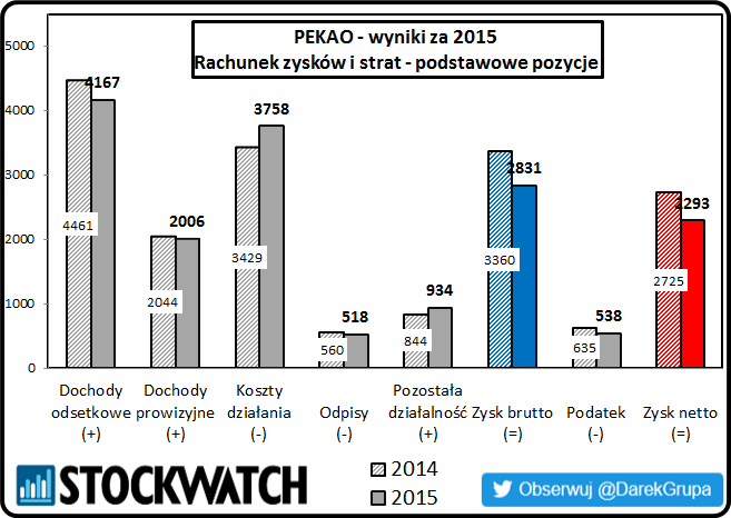 Trzecim czynnikiem jest jednorazowy dochód związany z przejęciem VISA Europe przez VISA Inc, co dało zysk w kwocie 262 mln zł. Były też zjawiska negatywne, których efektem był spadek dochodów. Taki wpływ na wyniki PEKAO miał słabszy wynik z pozostałej działalności operacyjnej i jednostek stowarzyszonych. Ostatecznie PEKAO w wyniku pozostałej działalności osiągnął w 2016 podobny wynik jak rok wcześniej.
