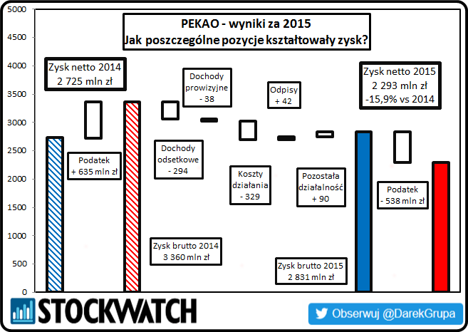 kliknij, aby powiększyć2016 rok zakończył się minimalnie niższym zyskiem niż 2015, ale spadek jest symboliczny - tylko 0,6%. W tej liczbie mieści jest już kwota podatku bankowego (450 mln zł). PEKAO zarobiło więc prawie 450 mln zł więcej niż w 2015, na co złożyły się 3 główne czynniki.