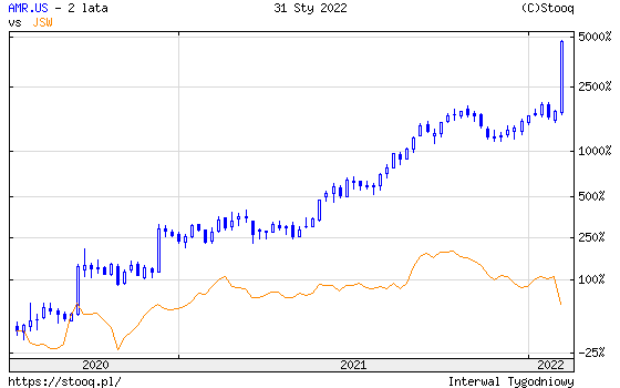 Spółka która wydobywa węgiel koksujący w USA, AMR Alpha Metallurgical Resources, bardzo podobny wykres do JSW, z tym że ona odbiła od dołka z 3.2020 o 1000% i wróciła do kursu z 2017-2018r  kliknij, aby powiększyć