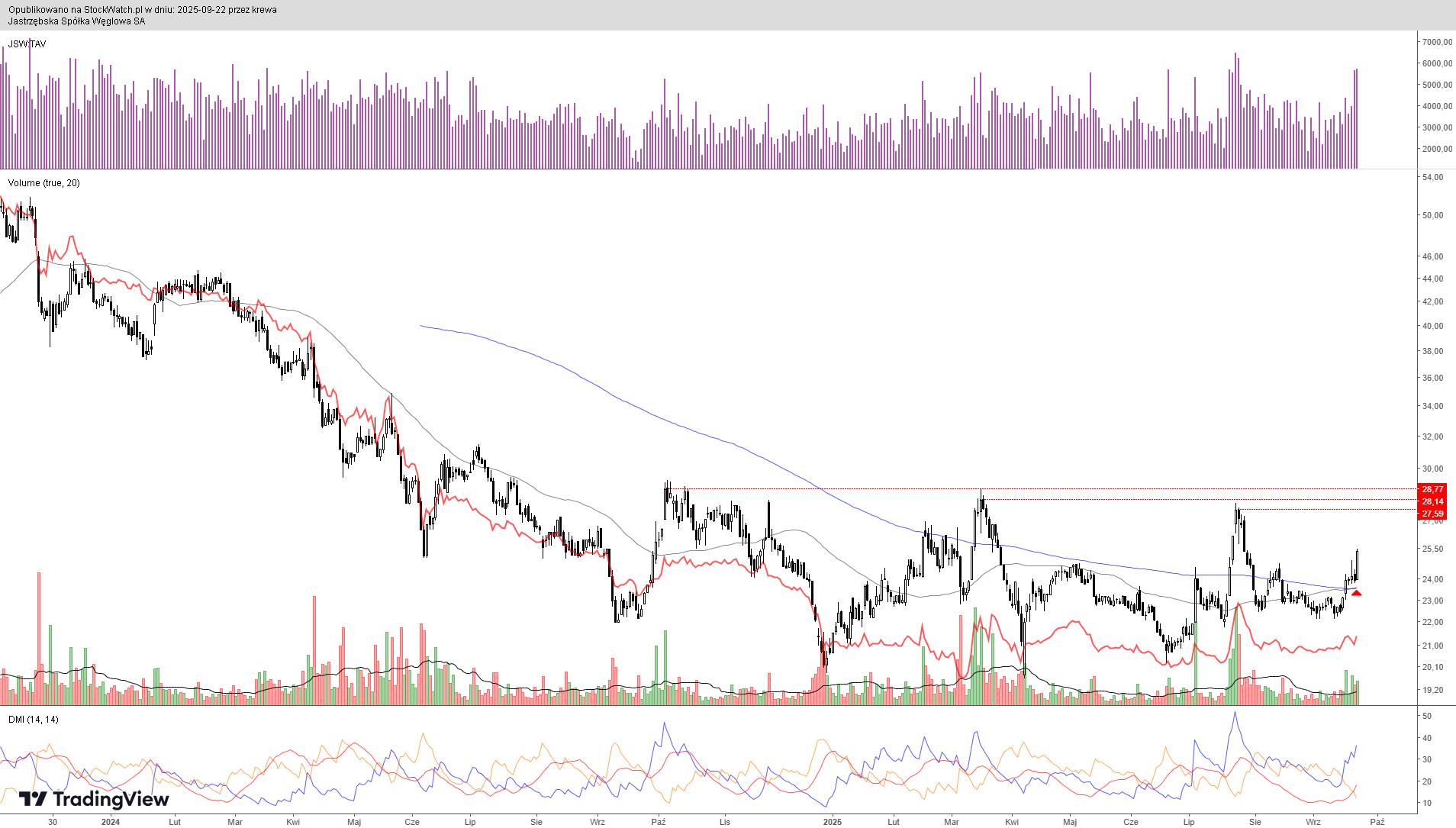 JSW - spojrzenie na wykres Wykres w interwale dziennym. To już trzecia wzrostowa sesja i zwyżce towarzyszy skokowy wzrost wolumenu oraz średniej wartości transakcji. Kurs znajduje się powyżej SMA200, ale historycznie to nie miało decydującego wpływu na kształt wykresu. Niemniej, wzrosty mogą be problemu sięgnąć oporu w okolicy 29 zł (pierwsza strefa oporu) ale i jej wybicie nie gwarantuje zmiany sentymentu. Ta mogłaby nastąpić wraz z pokonaniem oporu wyższego rzędu, wzmocnionego linią spadków (okolice 33 zł). Wskaźniki techniczne są po jasnej stronie mocy, więc rozbudowa wzrostów do wskazanych oporów jest możliwa.  kliknij, aby powiększyćPowyższa treść przez 21 dni była zarezerwowana tylko dla osób posiadających abonament.