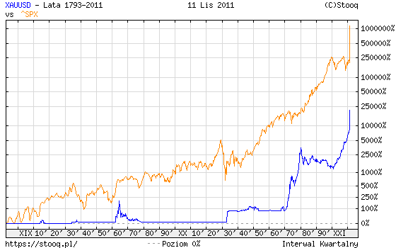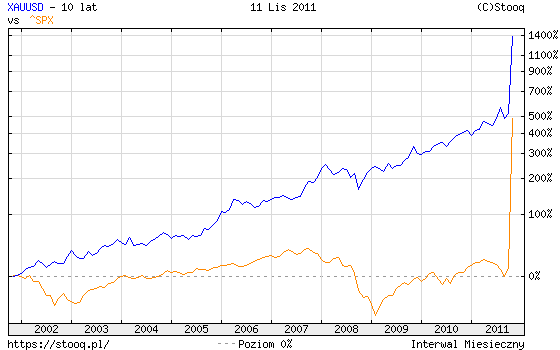 @Futroale wykres SPX jest trochę tendencyjny - czy uwzględnia zmiany firm, bankructwa i wypadnięcia z indeksu tych z sprzed 200 lat ? Przecież gdyby pokazać te poprzednie to wykres wyglądałby kompletnie inaczej. Wygląda tak bo w nim są zawsze firmy którym dobrze idzie, te którym idzie źle - wypadają z niego. a wykres złota byłby niezmienny. btw: ja nie piszę w postach wyżej że złoto jest wiecznym remedium i idealnym środkiem zawsze ( mathu powołuje się tam na mega spekulacje braci Hunt, IMO - niesłusznie bo czasy były zupełnie inne).. to nie tak - ono jest remedium na nasz czas gospodarek potężnie zadłużonych i dodruku wirtualnego pieniądza. W momencie kiedy gospodarki rynkowe ograniczą deficyty państwowe, pieniądz przestanie być tak mocno dodrukowywany jako sposób pobudzania rynków - złoto prawdopobnie wpadnie w boczniaka wieloletniego i przestanie być idealną lokatą. Póki co ciągle jest. Popatrz sobie na te same wykresy z punktu widzenia 10lat. Ten wykres obnaża słabość tego świata od końca lat 90tych.  kliknij, aby powiększyć* "Diversification is protection against ignorance, it makes little sense for those who know what they’re doing." W. Buffet. * "The market can remain irrational longer than you can remain solvent" * "scared money don’t make money" aktualny portfel szacunkowo: 75% CRJ, 20% PDG, 5% THD