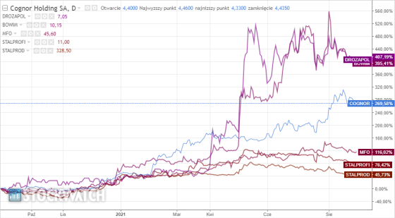 We wrześniu zyskiem z akcjonariuszami podzielą się też gwiazdy hossy na rynku stali. Cognor Holding wypłaci 25,71 mln zł, czyli 0,15 zł na akcję, a Drozapol-Profil 1,84 mln zł, czyli 0,30 zł na akcję. Stopy dywidend wynoszą odpowiednio 3,3 proc. i 4,2 proc. Warto jednak zauważyć, że notowania obu spółek mają za sobą potężne wzrosty. W ciągu roku akcje Cognoru podrożały o ponad 270 proc., a Drozapolu o ponad 400 proc. Wszystko dzięki skokowej poprawie wyników, którą napędza rajd cen stali i wyrobów stalowych. O spółkach z branży będzie jeszcze głośno, bo tegoroczne zasoby gotówkowe dają perspektywę na znacznie wyższe dywidendy w 2022 r.