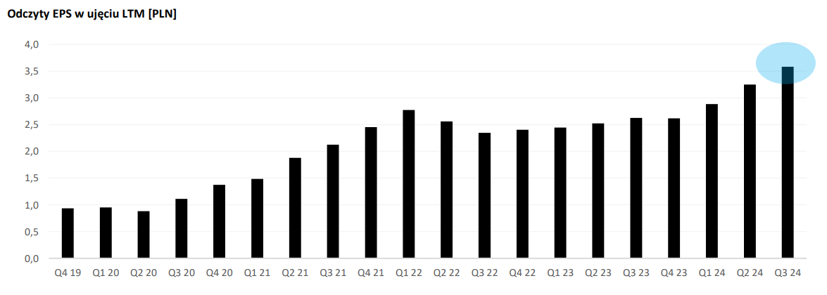 – Po Q3 2024 EPS za cztery ostanie kwartały br. wynosi 3,58 zł. Scenariusz utrzymania przez spółkę pozytywnych impulsów w obszarze reklamy telewizyjnej w ujęciu r/r także w Q4 2024 roku, według nas, potwierdzi iż Kino Polska na tle analizowanych przez nas podmiotów z obszaru TMT będzie wyróżniać się zdecydowanie in plus pod względem dynamiki wzrostu EPS za cały 2024 rok – dodał Bobrowski.