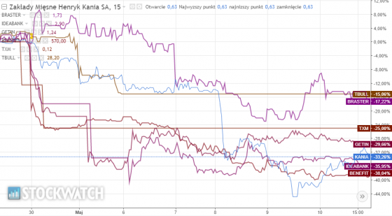 W maju problemy spółki wróciły ze zdwojoną siłą. W tydzień kurs akcji ZM Kania spadł o 33 proc. i po drodze ustalił historyczne minimum na poziomie 0,52 zł za akcję. Podobny los spotkał obligacje spółki notowane na Catalyst. Kurs KA10321 spadł do 70 proc. wartości nominału, KAN0321 – do 88 proc. w. nom., a KAN0619 do 74 proc. w. nom.