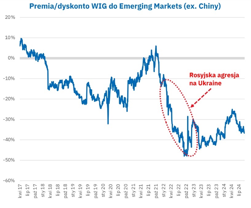 Zgodnie z obliczeniami towarzystwa, zniesienie dyskonta przekładałoby się to na zbliżający się nawet do 50 proc. potencjał umocnienia WIG-u. Problem jest jednak taki, że nic nie zapowiada, by wojna na Ukrainie miała się szybko skończyć. Zdaniem prezesa zarządu VIG/C-Quadrat TFI może ona potrwać nawet prawie do końca obecnej dekady. To zaś oznaczałoby, że z niższymi na tle podobnych rynków wycenami polskich akcji inwestorzy powinni się pogodzić na dłużej.