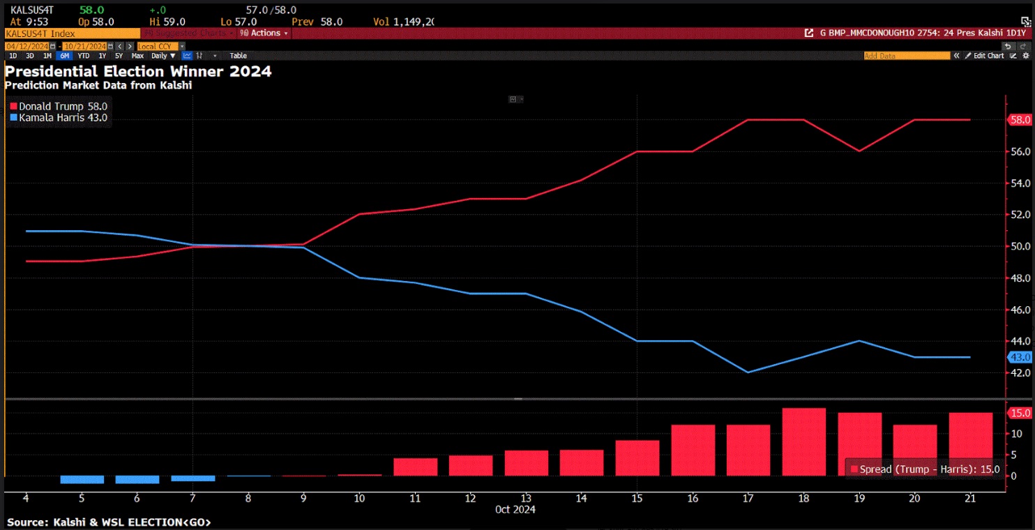 Według niego duża rozbieżność pomiędzy wynikami ankietowymi a szansami na wygraną zwiększa niepewność w ostatnich tygodniach przed rozpisanymi na listopad wyborami. Wygrana Trumpa jest obecnie oceniana jako korzystna dla notowań spółek technologicznych z USA oraz dolara, ale niekorzystna dla obligacji i akcji z rynków wschodzących.