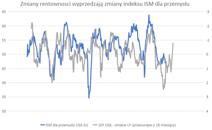 Jak wynika z jego obliczeń, zmiany rynkowych stóp procentowych (mierzonych przez rentowności 10-letnich obligacji USA) przewidywały zmiany indeksu ISM dla amerykańskiego przemysłu z około 18-miesięcznym wyprzedzeniem. Na sektor przemysłowy analityk zwraca uwagę dlatego, że jest on najbardziej wrażliwy na zmiany polityki monetarnej banku centralnego.