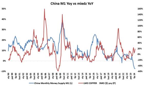 – Ostatni ujemny odczyt wskaźnika podaży pieniądza M1 mógłby być dla inwestorów ostrzeżeniem, że ceny miedzi w ujęciu rok do roku zaczną spadać – ocenia Cesarz.