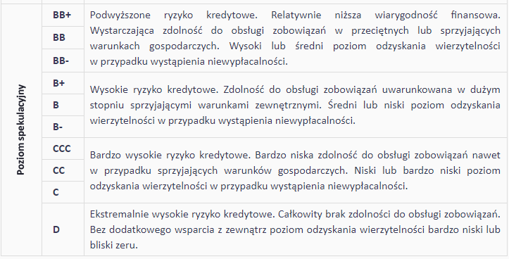 Prezentowany rating kredytowy jest ratingiem dla emitenta – jest ogólną oceną wiarygodności kredytowej ocenianego podmiotu i dotyczy ryzyka kredytowego jego niezabezpieczonych i niepodporządkowanych zobowiązań finansowych.