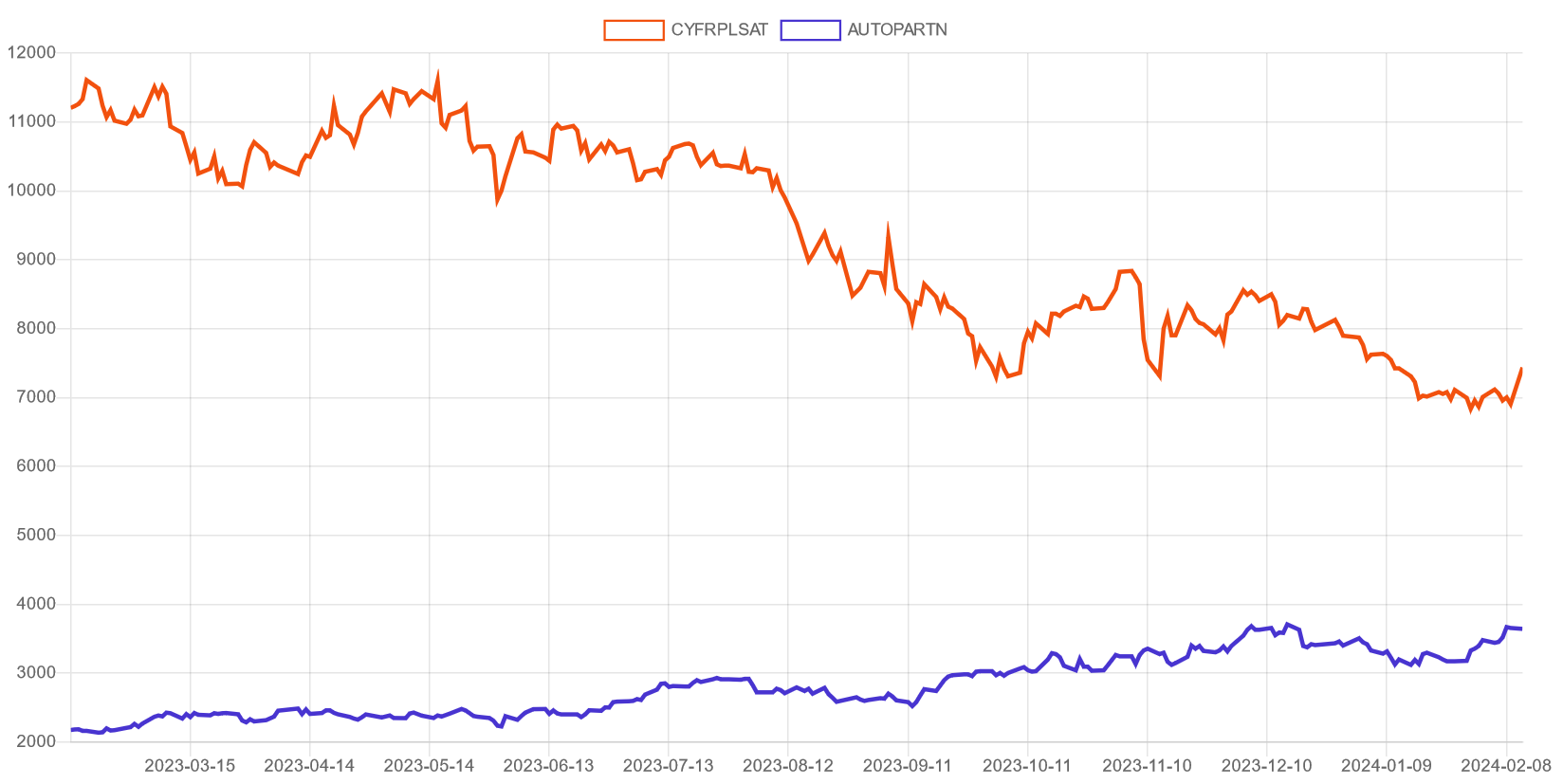 Porównanie kapitalizacji Cyfrowego Polsatu i Auto Partnera.