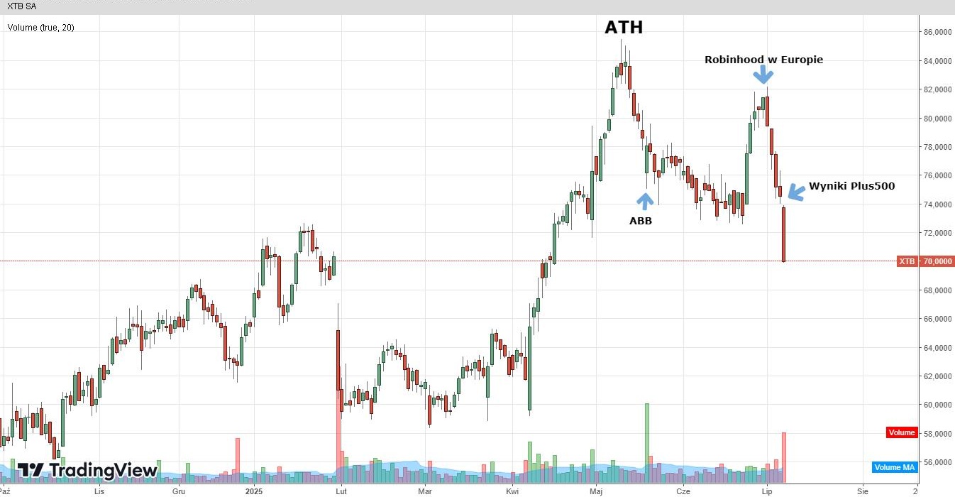 Tym razem impulsem do przeceny okazały się najnowsze wyniki branżowego konkurenta. W II kwartale 2025 roku Plus500 odnotował wzrost przychodów o 15 proc. rok do roku, do poziomu 209,3 mln USD. W ujęciu kwartał do kwartału wynik jest lepszy o zaledwie 2 proc. Sytuacja o tyle zaskakująca, że II kwartał stał pod znakiem szalonej zmienności na rynkach, spowodowanej m.in. cłami Trumpa czy wybuchem wojny na Bliskim Wschodzie.