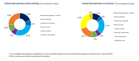 Jeżeli wszystkie nowe akcje zostaną wyemitowane i objęte przez inwestorów, a oferujący uplasują wszystkie akcje sprzedawane, po przeprowadzeniu oferty nowi akcjonariusze będą kontrolować 24,55 proc. podwyższonego kapitału zakładowego spółki i dysponować do 19,43 proc. głosów na WZA. Główni akcjonariusze spółki deklarują lock-up, ale warto jednak odnotować, że nie jest to standardowy („sztywny”) lock-up. W pewnych okolicznościach mogą oni sprzedawać akcje (więcej tutaj).