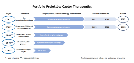 Captor Therapeutics prowadzi obecnie pięć projektów badawczo-rozwojowych na etapie odkrycia (w tym trzy znajdują się już w fazie optymalizacji związku wiodącego) oraz trzy projekty ukierunkowane na rozwój platformy technologicznej. Najbardziej zaawansowane projekty badawczo-rozwojowe w obszarze rozwoju leków to: CT1 – ukierunkowany na raka wątrobowokomórkowego, CT2 – celujący w nowotwory układu krwionośnego i choroby autoimmunologiczne oraz CT3 – ukierunkowany na terapie przeciwnowotworowe, przede wszystkim raka płuc, raka piersi, szpiczaków mnogich oraz chłoniaków. Rozpoczęcie I fazy badań klinicznych projektów CT1, CT2 i CT3 planowane jest w 2023 r. Kolejne dwa projekty dotyczą: opracowania i rozwoju pierwszego w klasie kandydata na lek – małocząsteczkowego degradera w terapii raka jelita grubego (CT4) oraz zastosowania technologii celowanej degradacji białek w nieswoistym zapaleniu jelit, chorobie Crohna, terapii łuszczycy i reumatoidalnego zapalenia stawów (CT5). Spółka szacuje, że projekty CT4 i CT5 znajdą się w fazie I badań klinicznych między 2023 a 2025 r.
