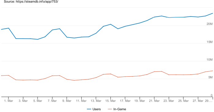 Statystyki jednocześnie zalogowanych i grających użytkowników Steam z ostatniego miesiąca. Źródło: steamdb.info