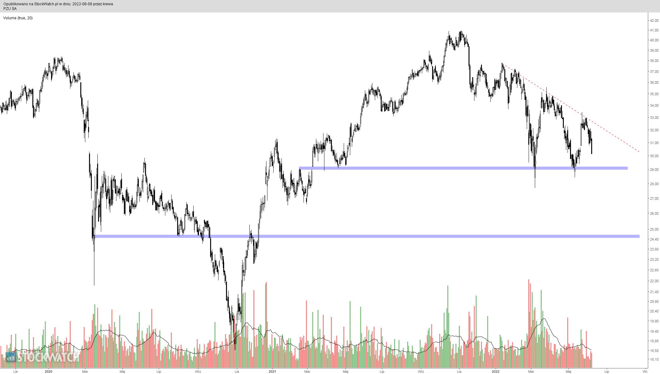 Sekwencja opadających szczytów i sporych rozmiarów czarne korpusy świec narysowane w ostatnich tygodniach wskazują na nieuniknioną konfrontację ze wsparciem na poziomie 29 zł. Wiosenne swingi da się ubrać w ramiona trójkąta zniżkującego. Słupki wolumenu systematycznie maleją od marca bieżącego roku, zatem jego skokowy wzrost przy wybiciu któregoś z ramion będzie wiarygodnym potwierdzeniem wybranego kierunku poruszania się cen. Utrata wsparcia na poziomie 29 zł zrzuci notowania piętro niżej, do poziomu 24,50 zł.