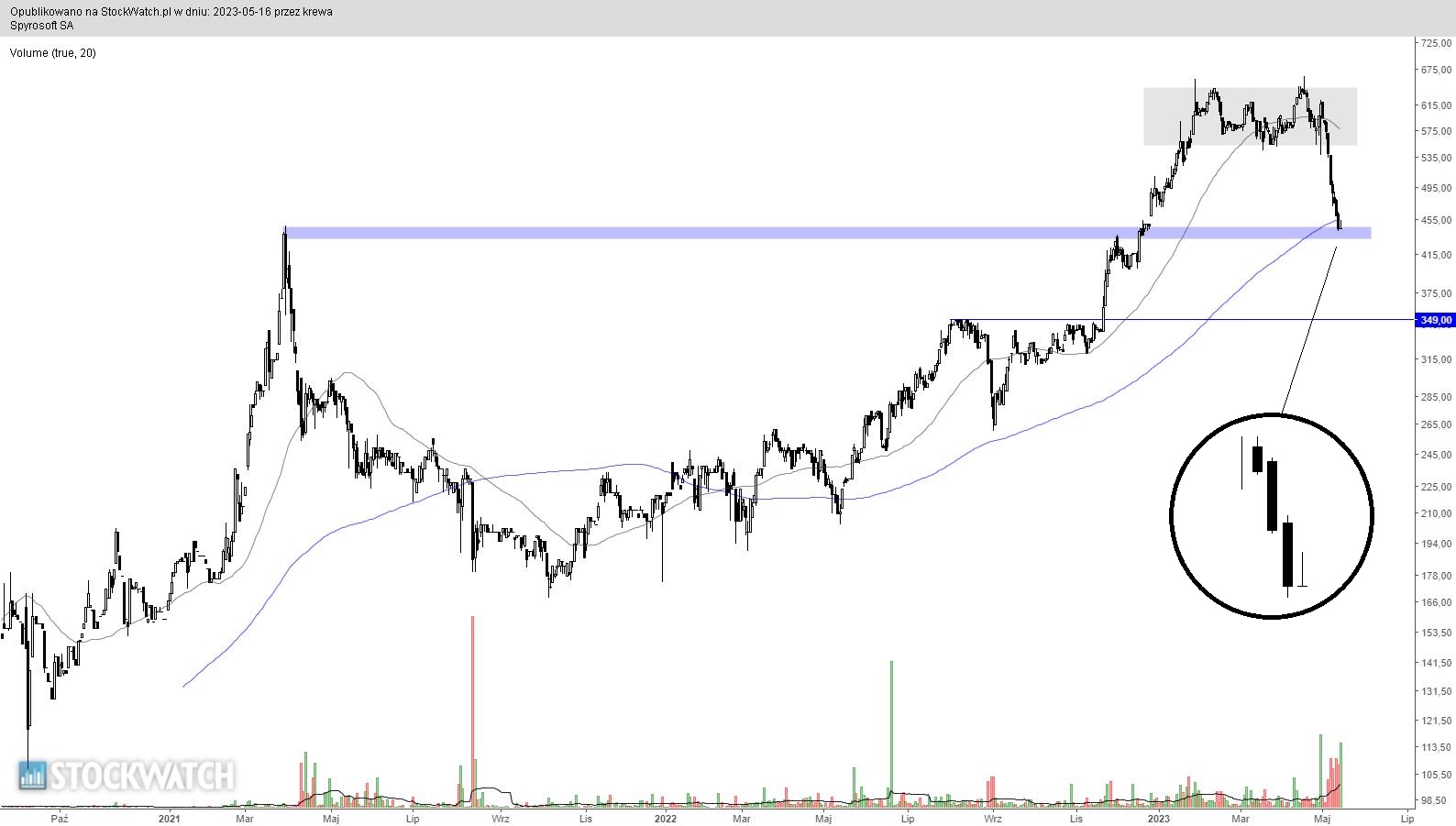 Maj na wykresie Spyrosoft przyniósł spodziewaną korektę, która sprowadziła kurs akcji w okolice pierwszego istotnego wsparcia.