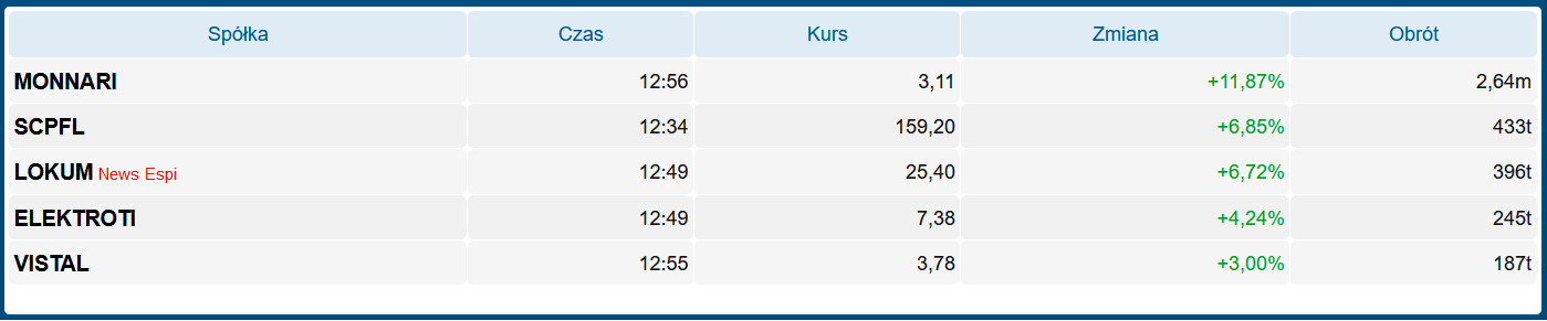 Oprócz Monnari skaner „gorących spółek” na stronie Stockwatch.pl wskazuje jeszcze m.in. na Vistal Gdynia (+2,72 proc.), Elektrotim (+2,82 proc.), Lokum Deweloper (+5 proc.), Art Games Studio (-5 proc.), Bogdankę (-4,6 proc.) czy Open Finance (-3,06 proc.).