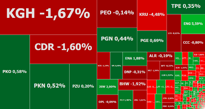W indeksie WIG20 ponad 1-proc. wzrosty notowały tylko trzy spółki: JSW, Play i PGE. Najsłabszym ogniwem był z kolei KGHM, którego akcje taniały o 2 proc. do 93,74 zł.