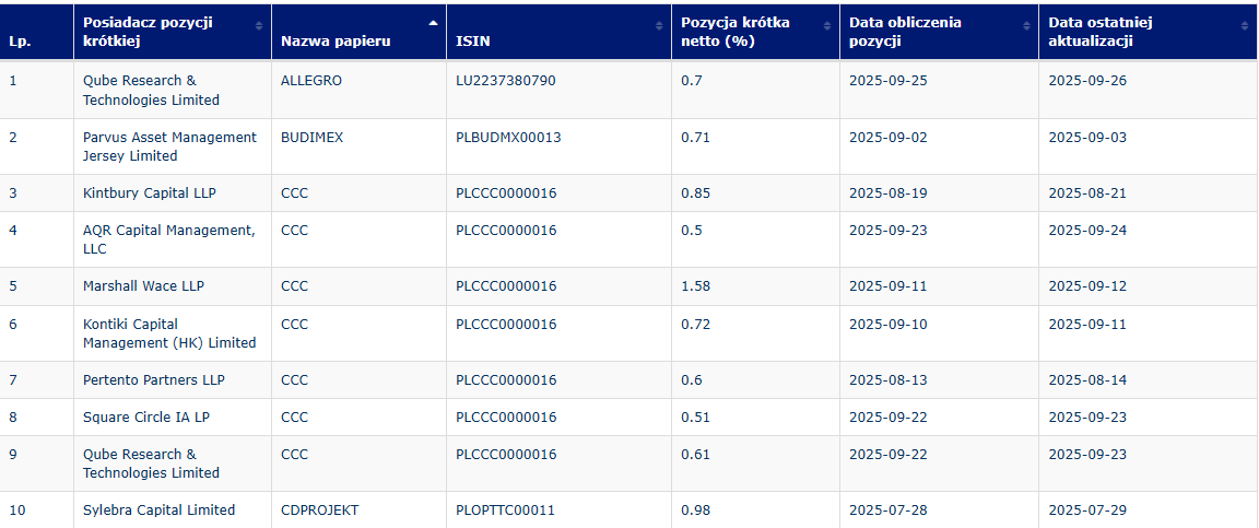 Aktualnie w rejestrze krótkiej sprzedaży KNF widnieją 23 pozycje na spółki notowane na GPW. Najwięcej tzw. shortów jest na CCC. Aż 7 funduszy posiada na krótko 5,37 proc. akcji spółki.