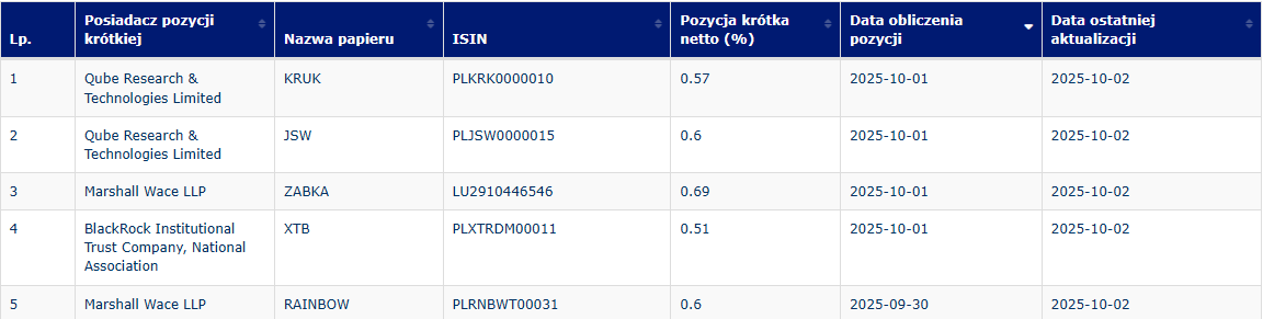 W październiku w rejestrze krótkiej sprzedaży KNF pojawiły sie nowe wpisy. BlackRock Institutional Trust Company National Association ujawnił z pozycją 0,51 proc. na spółce XTB. Marshall Wace LLP zaraportował 0,69 proc. na krótko na Żabce i 0,6 proc. na Rainbow Tours. Z kolei Qube Research & Technologies Limited ujawnił 0,6 proc. na JSW oraz 0,57 proc. na Kruku.