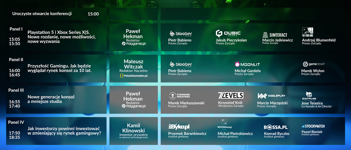 Nasze wydarzenie zamknie IV panel moderowany przez Kamila Klinowskiego – niezwykle doświadczonego inwestora indywidualnego i ekonomisty, zasiadającego w radach nadzorczych wschodzących projektów gamingowych. Jak inwestorzy powinni inwestować w zmieniający się rynek gamingowy? Na to pytanie odpowiedzą: Przemysław Barankiewicz (CFA Society Poland, zbyka.pl), Michal Pietrzkiewicz (INVESTIN(Gaming), Konrad Ryczko (analityk DM BOŚ) oraz Paweł Bieniek (szef działu analiz StockWatch.pl).