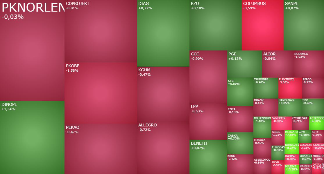 Po dwóch godzinach środowych notowań CD Projekt przesunął się do grona spółek rosnących, której przewodziły akcje Dino Polska, zyskujące 1,27 proc. (460,90 zł). Najsłabszą spółką w indeksie było natomiast CCC, którego kurs spadał o 1,88 proc. do 229,40 zł.