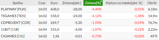 [16:25] Kiepska sesja dla całego giełdowego gamingu. Przecena debiutanta kładzie się cieniem na branży. Indeks WIG-Games traci 2,85 proc.