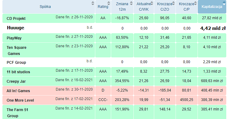 [10:20] Huuuge jest obecnie 2. po CD Projekcie największą spółką w branży gamingowej. Przy kursie 52,50 zł kapitalizacja amerykańskiego producenta gier wynosi 4,42 mld zł.