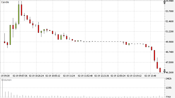 [14:00] Popołudniowa stabilizacja okazała się przysłowiową ciszą przed burzą. Około 14:00 notowania zanurkowały. Kurs akcji spada momentami o 8 proc. W dołku za jeden walor płacono 46 zł.