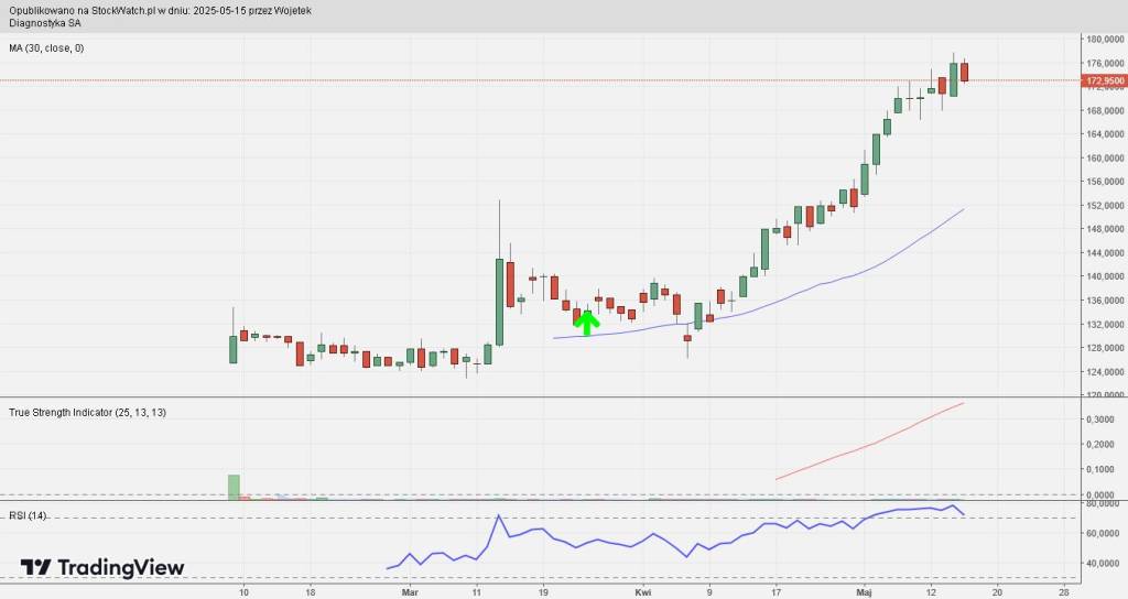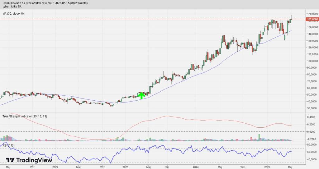 – Najstarszą pozycją w portfelu CFR jest cyber_Folks kupiony jeszcze w 2023 roku. Trend wzrostowy na tej spółce jest nadal kontynuowany, więc w ślad zanim podnoszone jest zlecenie obronne – komentuje prowadzący portfele Cztery Fazy Rynku.