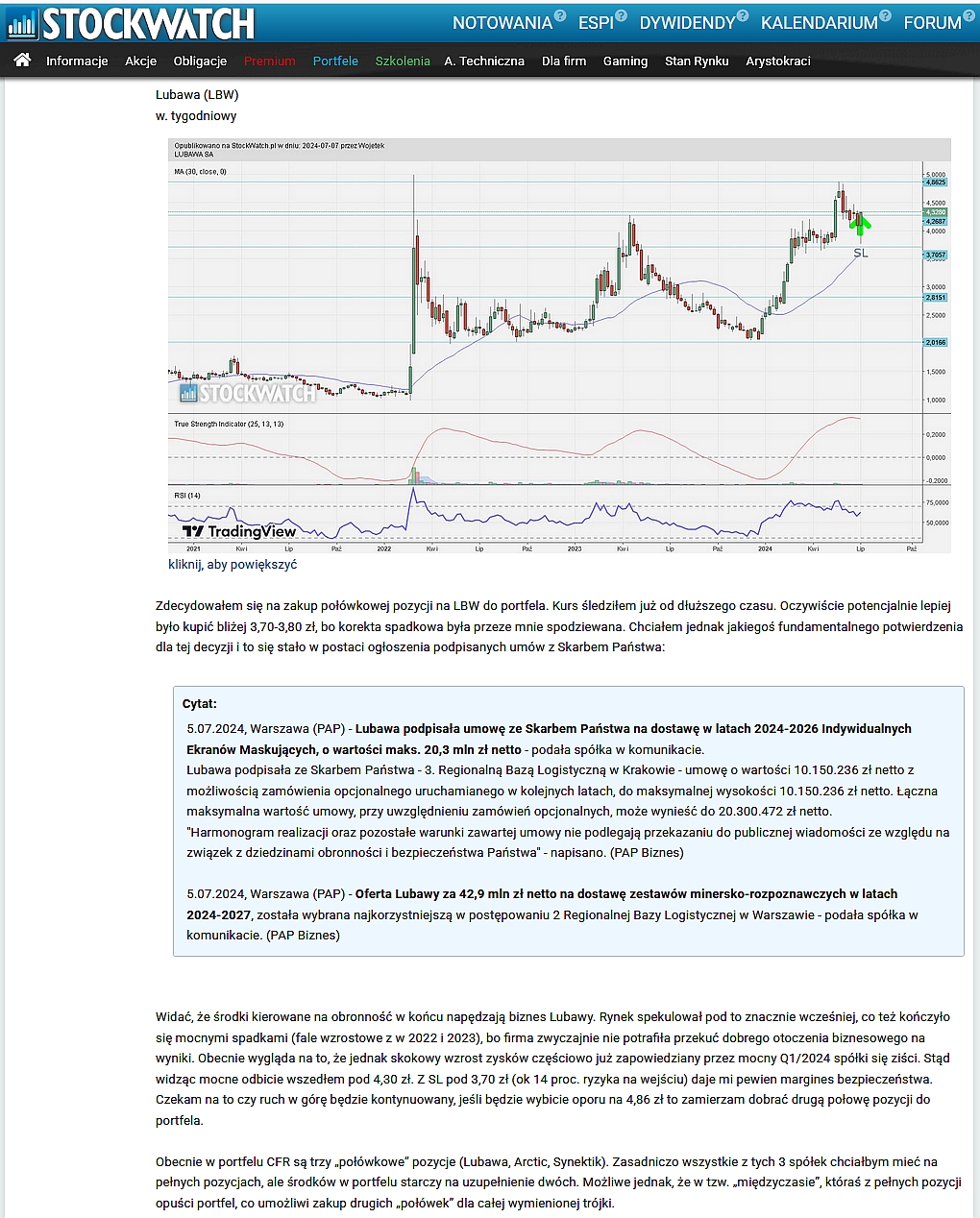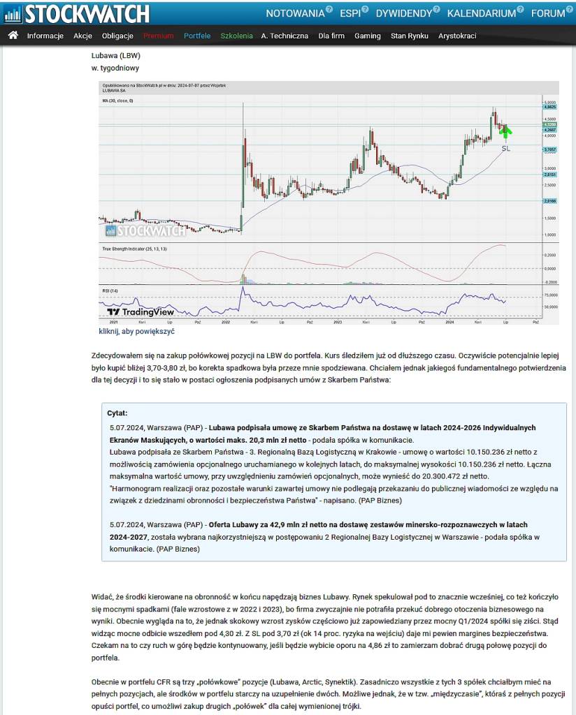 Abonenci Portfeli Cztery Fazy Rynku otrzymują powiadomienia e-mail o dokonanych transakcjach w portfelu oraz 2 biuletyny tygodniowo z analizami. Każdy z biuletynów składa się z podsumowania tego co dzieje się w portfelach, omówienia sytuacji technicznej i fundamentalnej na spółkach z portfela, a także tych godnych uwagi, które są później obserwowane pod kątem zajęcia nowej pozycji w portfelach. Każdy biuletyn podsumowuje krótka analiza „flash” wszystkich obserwowanych oraz portfelowych walorów. Poniżej fragment jednego z biuletynów z 2024 roku: