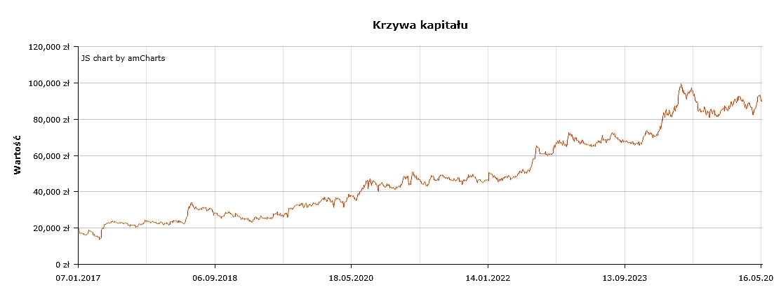 Krzywa kapitału portfela akcyjnego CFR. W ciągu 8 lat prowadzenia portfela z początkowych 20 000 zł wartość portfela wzrosła do ponad 90 000 zł