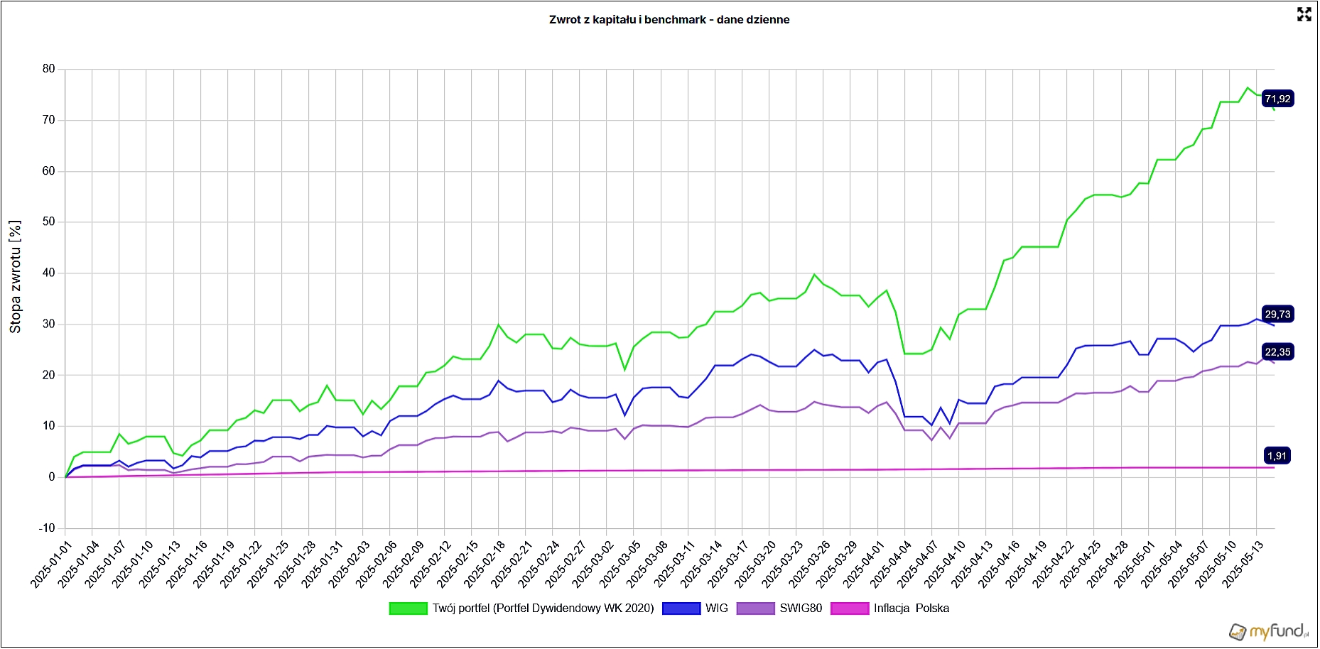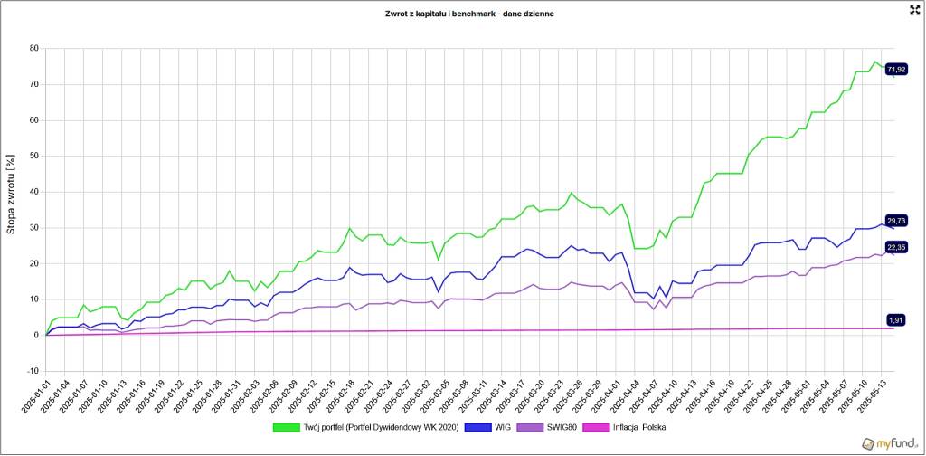 – W 2025 roku portfel dywidendowy znacząco bije zarówno stopę zwrotu z szerokiego rynku (WIG) jak i indeksu małych spółek (sWIG80) – dodaje.