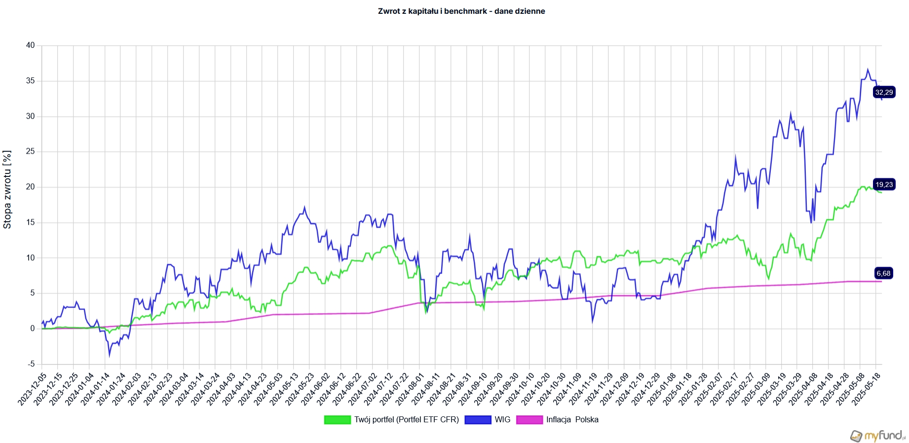 – Stopa zwrotu z portfela ETF od jego założenia znacząco przebiła inflację w tym czasie. Szeroki rynek obecnie znajduje się wyżej, jednak nie dziwi to biorąc pod uwagę siłę GPW w 2025 roku – mówi prowadzący portfele CFR.