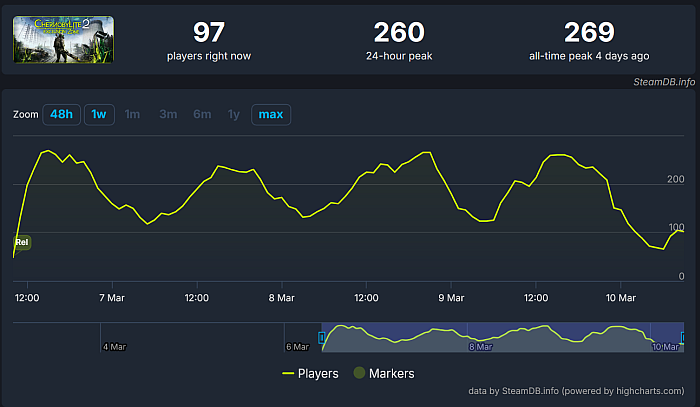 Chernobylite 2 nie dorównało popularnością swojej poprzedniczce. W pierwszą część gry w październiku 2019 roku w dniu premiery w trybie early access grało 947 graczy. Natomiast w Chernobylite 2: Exclusion Zone 6 marca 2025 grało maksymalnie jedynie 269 graczy. Oczywiście to jeszcze nie przekreśla drugiej części. Pierwszy Chernobylite spędził w trybie wczesnego dostępu blisko 2 lata i przy pełnej premierze w czerwcu 2021 roku peak graczy na Steamie sięgnął blisko 4 tys. graczy.