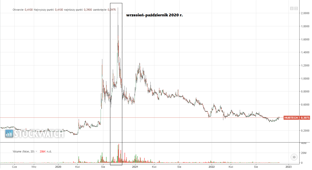 W okresie między wrześniem a październikiem 2020 r. kurs akcji HUB.Tech zanotował gigantyczne wahania. W pierwszych dniach września za jeden walor spółki płacono ok. 70 groszy. W ciągu kolejnych dwóch tygodniu cena podskoczyła powyżej 1,12 zł, ale prawdziwy rajd miał miejsce miesiąc później. W pierwszej połowie października kurs akcji wystrzelił z okolic 90 groszy do ponad 2 zł. Przebicie okrągłego poziomu trwało krótko i okazało się momentem zwrotnym. Notowania HUB.Techu jeszcze w październiku wróciły do punktu wyjścia.