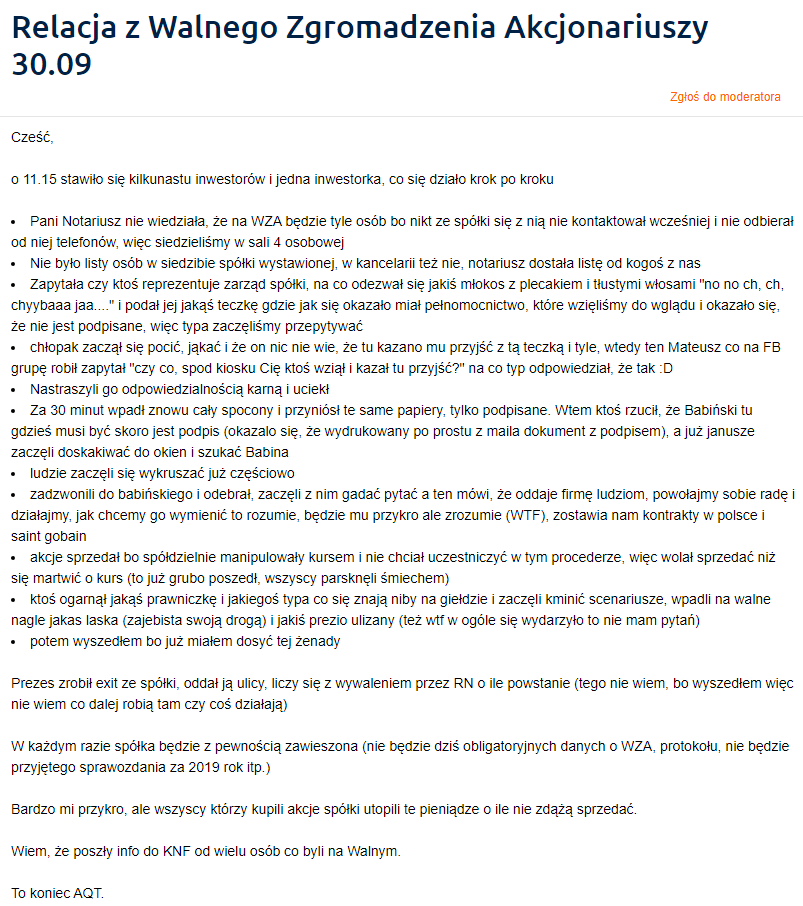 Relacja jednego z uczestników walnego AQT. Źródło: forum bankier.pl Kliknij, aby powiększyć.
