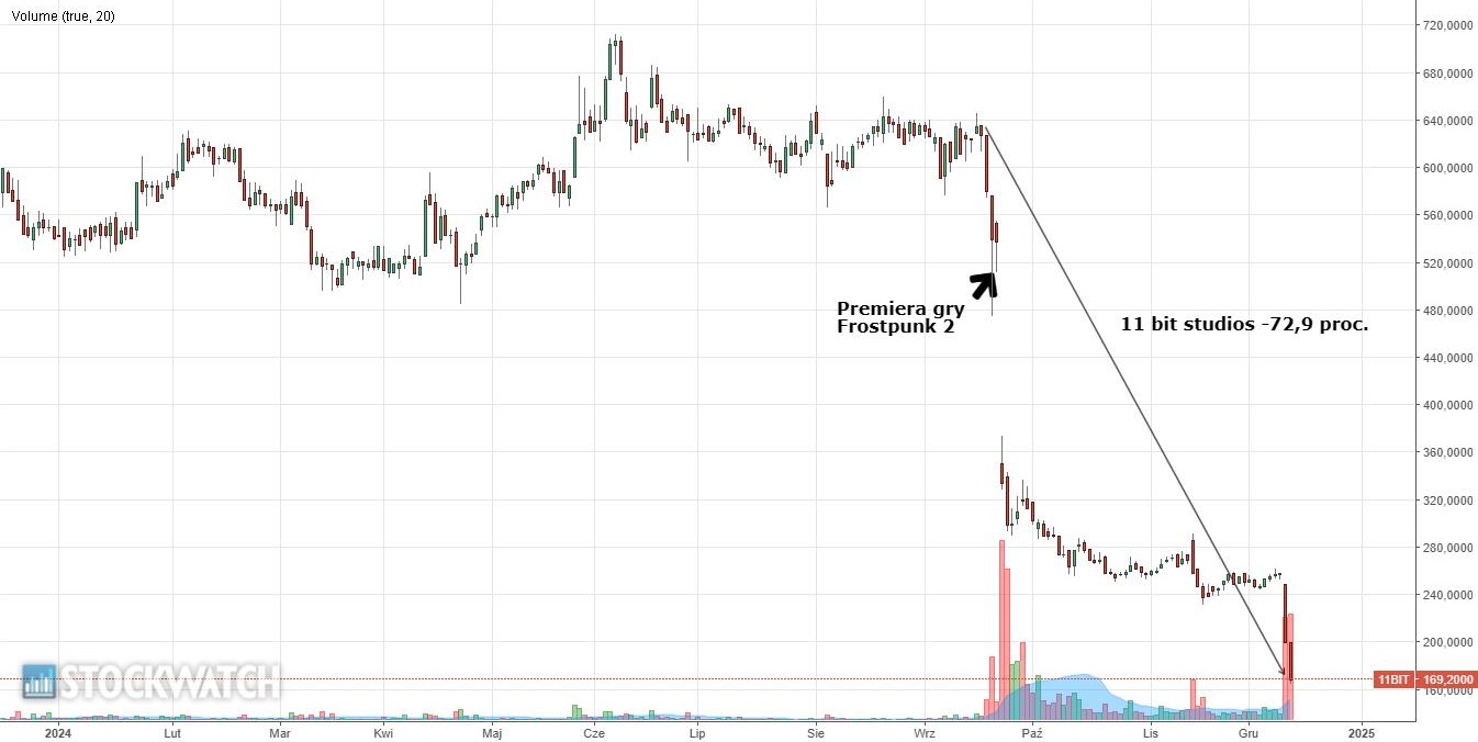 Sygnały o możliwym odpisie przelały czarę goryczy nawet wśród najbardziej zagorzałych akcjonariuszy 11 bit studios. Część z nich miała świeżo w pamięci przecenę z września, gdy kurs na przestrzeni zaledwie 5 sesji spadł z okolic 630 zł do 298 zł. W środę notowania 11 bit studios spadły o 22,6 proc. do 200,50 zł, a w czwartek zanurkowały o kolejne 15,6 proc. do 169,20 zł. Tym samym kurs akcji cofnął się do poziomów z grudnia 2017 r., gdy studio było 3 lata po premierze bestsellerowego This War of Mine i kilka miesięcy przed wypuszczeniem pierwszej części Frostpunka.