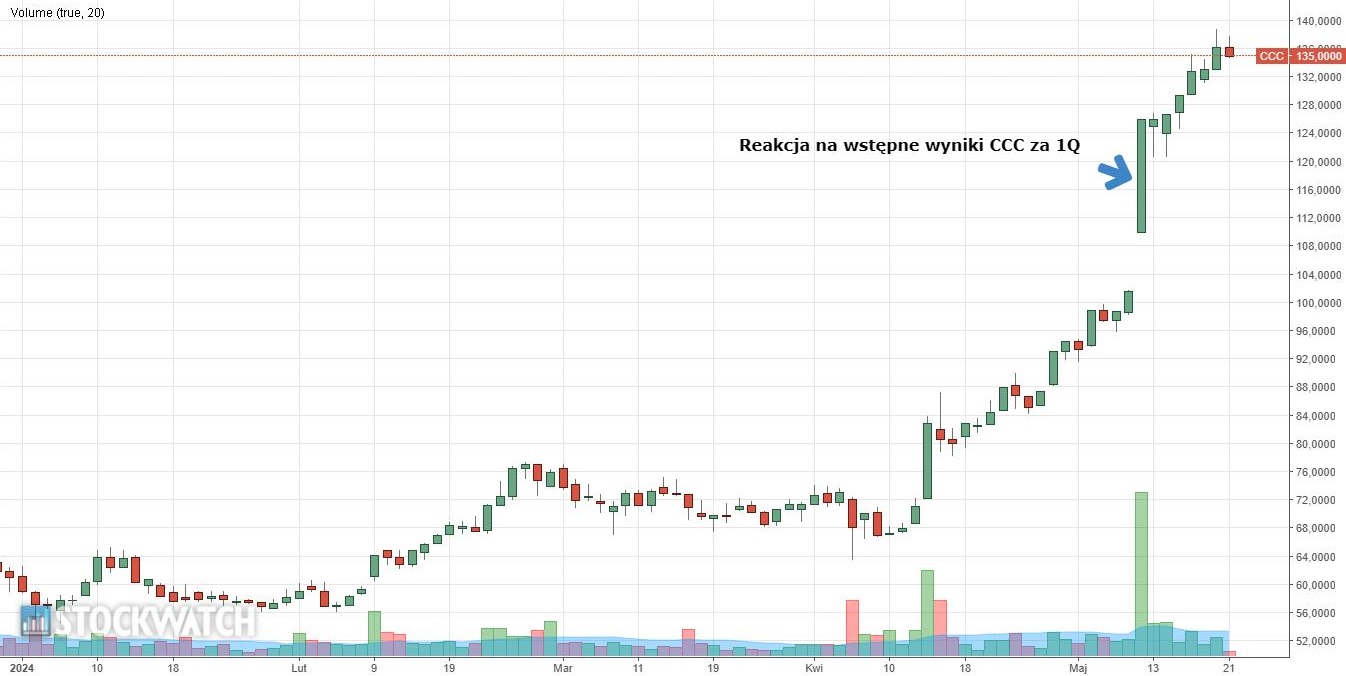 Więcej niż podwojenie wartości notują w ciągu ostatnich sześciu tygodni akcje CCC. W ubiegłym tygodniu kurs przebił szczyt pandemicznej hossy z lipca 2021 r., a w poniedziałek poprawił pięcioletni szczyt, rosnąc o kolejne ponad 2 proc. Prawdziwą euforię wywołały wstępne wyniki kwartalne – tylko na pierwszej sesji po ich podaniu kurs skoczył o 24 proc.