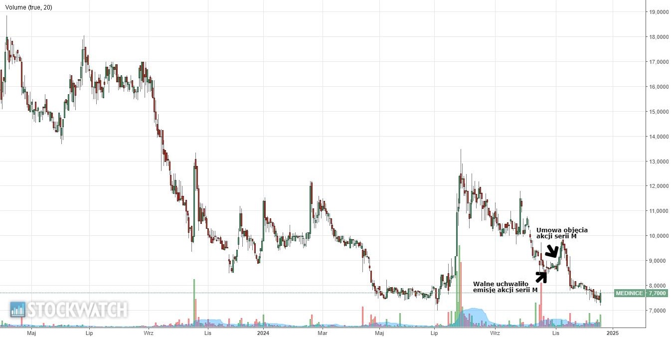 Dzięki listopadowej emisji akcji Medinice zabezpieczyło sobie potrzeby gotówkowe do końca przyszłego roku, jednak wcale nie skłoniło to inwestorów do zaprzestania wyprzedawania akcji spółki. Jesienią med-tech pozyskał od inwestorów 9,6 mln zł, które mają mu pozwolić na dalsze inwestowanie w badania kliniczne i rozwój opracowywanych technologii.
