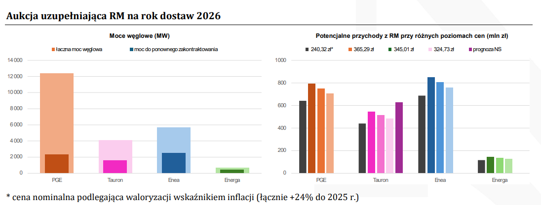 – Wyniki tej aukcji są bardzo ważne dla największych koncernów, gdyż znaczna część ich węglowej floty wytwórczej traci z końcem br. wsparcie z rynku mocy. (…) Zarządy spółek wielokrotnie deklarowały, że konsekwencją braku wsparcia z rynku mocy będzie rychłe zamknięcie starszych bloków węglowych. Mamy duże obawy co do realizacji tych zapowiedzi, czego dobrym przykładem może być wydłużenie pracy bloków węglowych w Dolnej Odrze oraz w Rybniku poza zadeklarowany wstępnie przez PGE termin – komentuje Michał Sztabler, analityk Noble Securities.