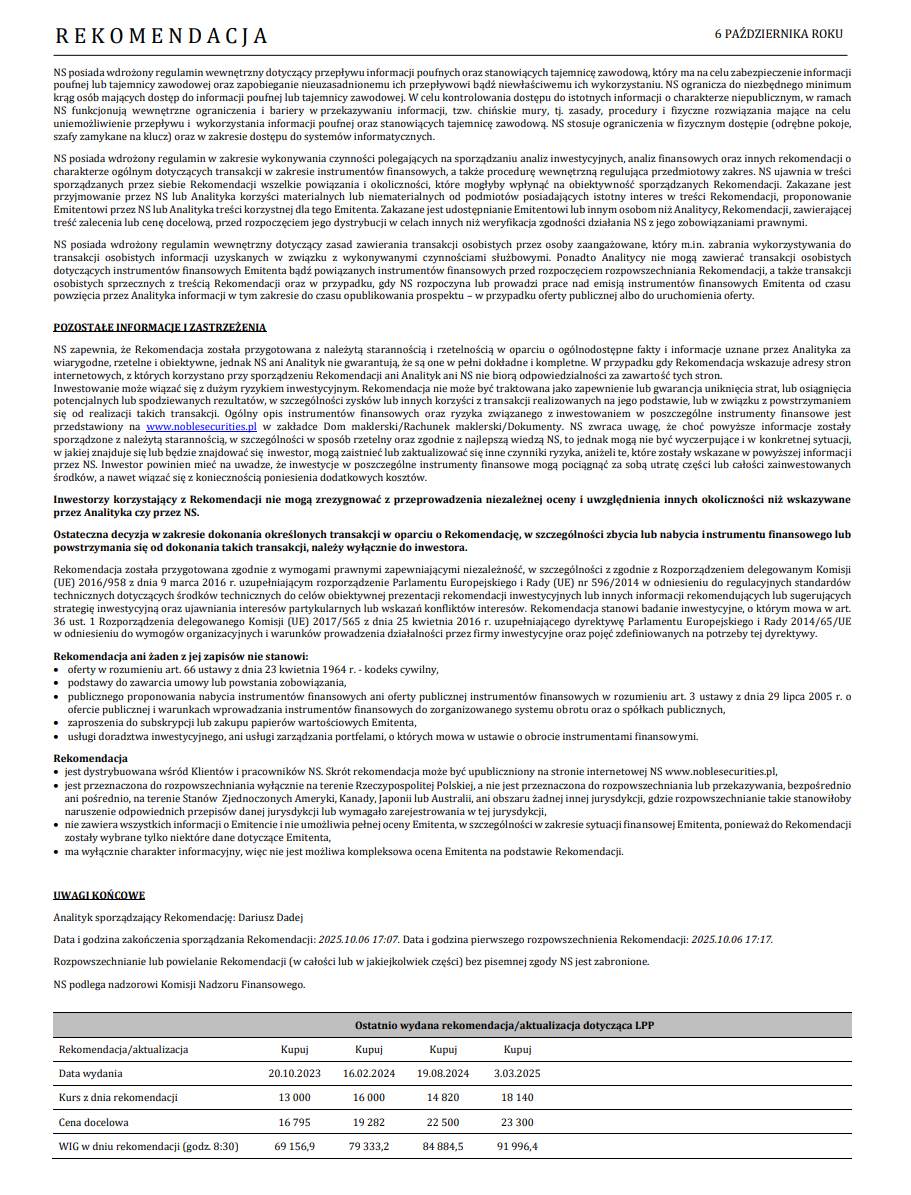 Rekomendacja dla LPP powstała 6 października 2025 r. Autorem rekomendacji jest Dariusz Dadej, analityk Noble Securities. Wymagany prawem disclaimer jest do pobrania TUTAJ
