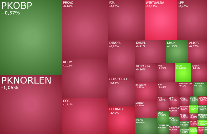 Odwrotną reakcję na obserwujemy na akcjach Wirtualnej Polski. Tanieją one aż o 10,14 proc. do 66,50 zł, przy okazji opuszczając dołem 2-miesięczną konsolidację, a także przełamując lokalne dołki z marca i czerwca br. Na gruncie analizy technicznej kurs ma otwartą drogę do grudniowego dołka na poziomie 62,31 zł.