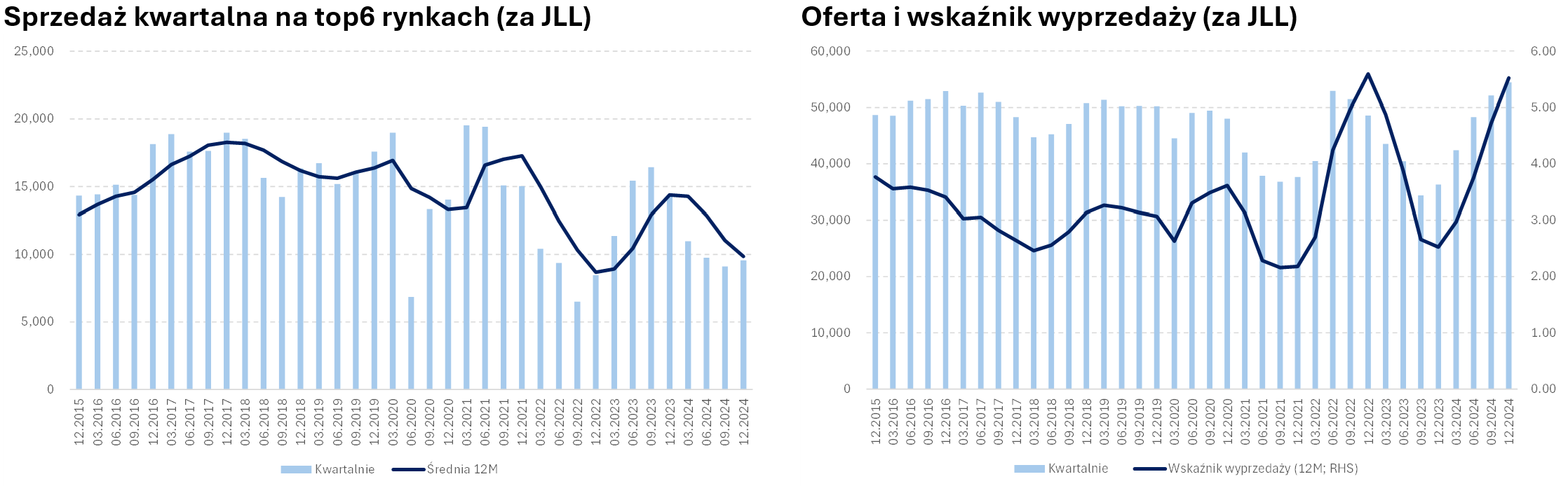 Według danych JLL sprzedaż na sześciu największych rynkach w Polsce (Warszawa, Łódź, Kraków, Wrocław, Poznań i Trójmiasto) zamknęła się na poziomie 9,6 tys. mieszkań, co jest poziomem o 5 proc. wyższym niż w trzecim kwartale, ale aż o 1/3 niższym r/r. W tym samym czasie oferta urosła z ok. 36 tys. na 54,4 tys. ( 50 proc. r/r), co znacznie zwiększyło wskaźnik wyprzedaży oferty – z 2,5x na koniec 2023 do 5,5x (licząc na 12 miesięcznej średniej sprzedaży).