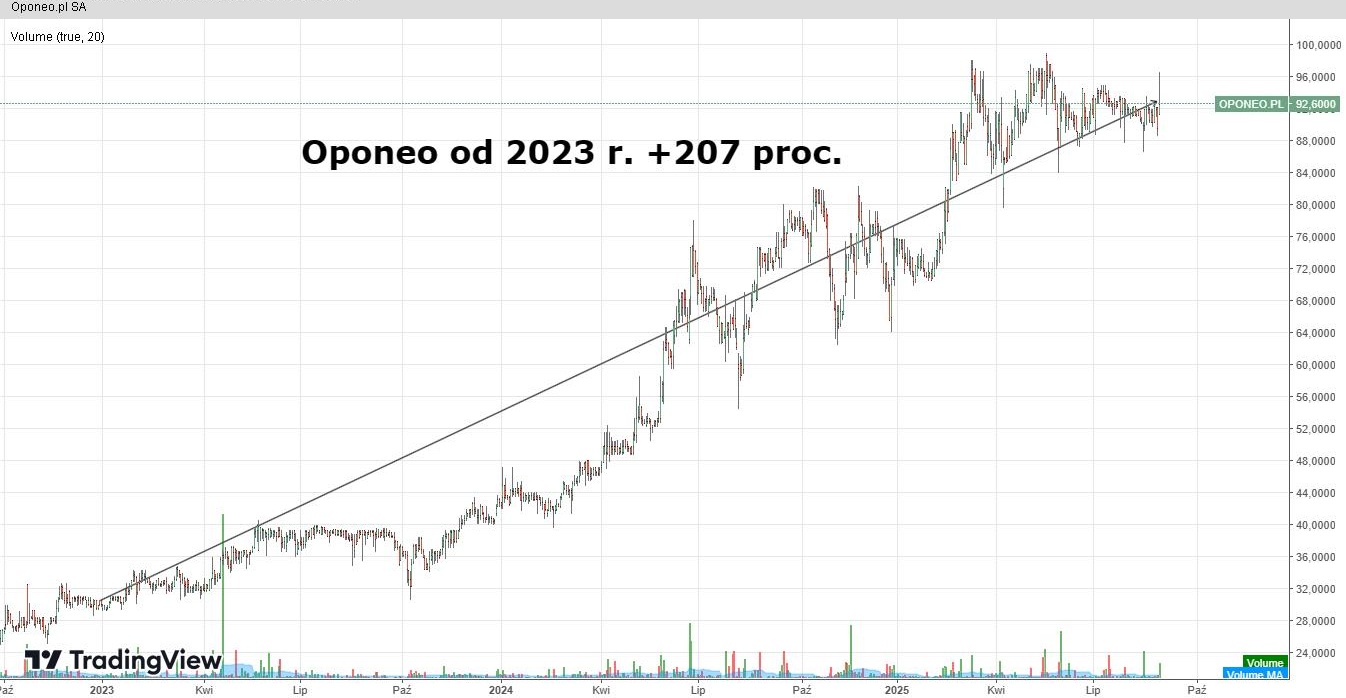 Grupa Oponeo to jedna z cichych gwiazd warszawskiego parkietu. Określenie „cicha” nie jest tu przypadkowe, bo mimo imponującego wzrostu skali biznesu, spółka dość rzadko pojawia się w nagłówkach mediów giełdowych. Co więcej, pokrycie analityczne dla internetowego dystrybutora opon i felg dostarcza tylko jedno biuro maklerskie i to w ramach GPWPA, czyli na zlecenie GPW. Tymczasem mowa o spółce, której akcje jeszcze na początku 2023 r. były wyceniane na ok. 35 zł. Rok później kurs sięgał 50 zł, a wiosną 2025 r. po raz pierwszy przekroczył poziom 100 zł za akcję. W międzyczasie spółka wypłaciła w trzech dywidendach łącznie 13,80 zł na akcję, z czego blisko połowę tej kwoty w 2025 r.