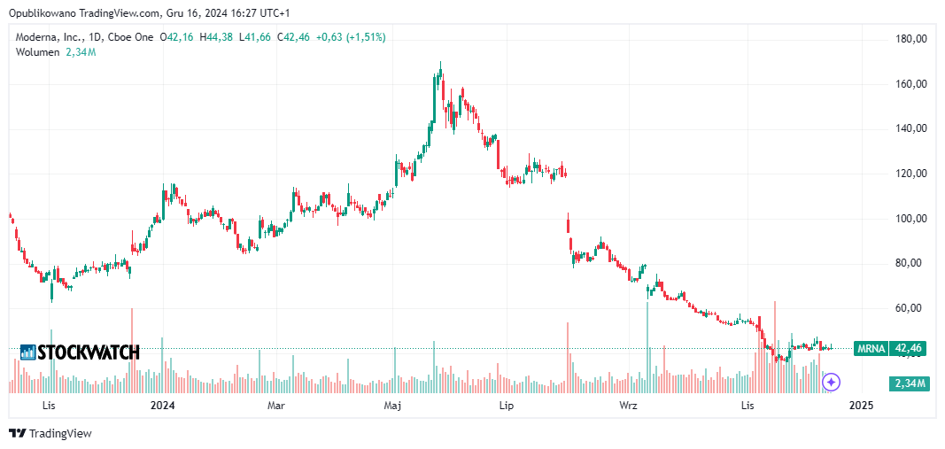 Jeszcze pod koniec maja za jedną akcję producenta szczepionek płacono 170,47 dolarów. Jednak od tamtego czasu kurs akcji spółki spada, a w połowie grudnia za jeden walor trzeba zapłacić 41,83 dolarów. To spadek aż o 75 proc.